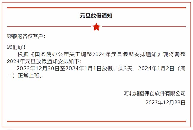 首頁(yè) > 石家莊用友軟件 > 【假期】2024年鴻圖偉創(chuàng)-用友軟件元旦放假及值班安排