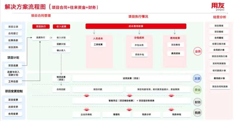 在系統(tǒng)里,通過項(xiàng)目進(jìn)度在線填報(bào)、計(jì)劃高效協(xié)同、項(xiàng)目工時(shí)管理、在線審批、項(xiàng)目變更過程管理、項(xiàng)目進(jìn)度與結(jié)算回款一體化、項(xiàng)目執(zhí)行過程中涉及的人員、費(fèi)用、分包成本按項(xiàng)目歸集核算、業(yè)財(cái)數(shù)據(jù)分析一體化、業(yè)票財(cái)稅一體化、實(shí)時(shí)化、自動(dòng)化,幫助項(xiàng)目會(huì)計(jì)、企業(yè)高管老板,降本增效。