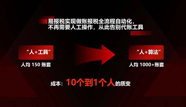 暢捷通直擊行業(yè)痛點:傳統(tǒng)代賬模式下,企業(yè)深陷價格戰(zhàn)激烈、同質化競爭、合規(guī)要求提升及客戶需求變化等。面對這些挑戰(zhàn),易報稅以“人+算法”的新模式,為代賬企業(yè)提供了開源節(jié)流的解決方案。