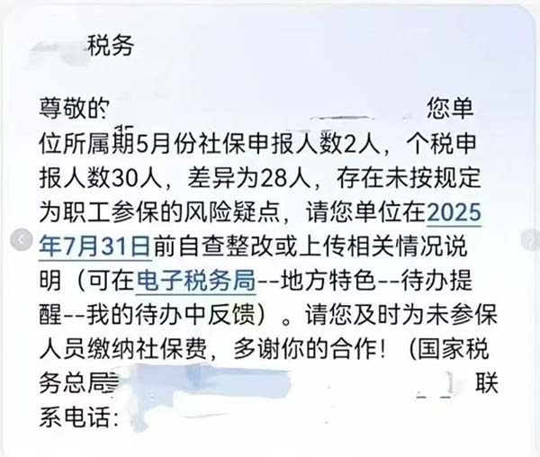 您單位所屬期5月份社保申報人數(shù)2人,個稅申報人數(shù)30人,差異28人,存在未按規(guī)定為職工參保的風(fēng)險疑點,請您單位在2025年7月31日前自查整改或上傳相關(guān)情況說明。請您及時為參保人員繳納社保費,多謝你的合作!