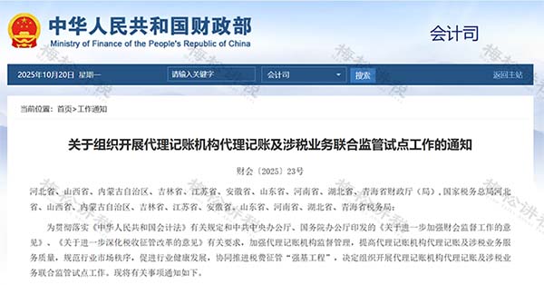 10月17日,財(cái)政部 國(guó)家稅務(wù)總局發(fā)布《關(guān)于組織開(kāi)展代理記賬機(jī)構(gòu)代理記賬及涉稅業(yè)務(wù)聯(lián)合監(jiān)管試點(diǎn)工作的通知》。